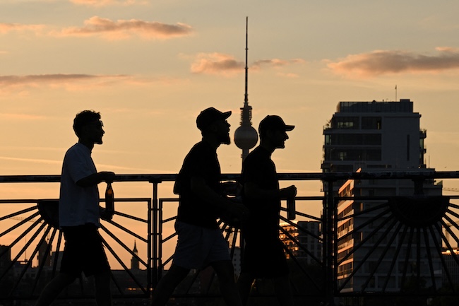 People walk across the Oberbaum bridge at sunset, with the television tower in the background in Berlin, Germany, August 17, 2025. REUTERS/Annegret Hilse