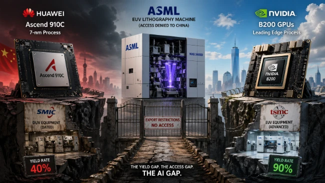 That's the current yield rate on Huawei's most advanced AI chip, the Ascend 910C — meaning that for every ten chips that go into production, six are scrapped. Nvidia's equivalent chips, made at Taiwan Semiconductor Manufacturing Company (TSMC) using the world's most advanced lithography, yield upward of 90%. That single statistic encapsulates a manufacturing disadvantage that's wider, deeper, and more structurally entrenched than most coverage of the "AI race" lets on.