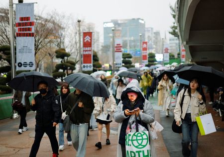 Fans of K-pop boy band BTS, known as ARMY, walk outside the concert venue ahead of the band's first world‑tour concert "ARIRANG" in more than three years, at Goyang stadium in Goyang, South Korea, April 9, 2026. REUTERS/Kim Soo-hyeon