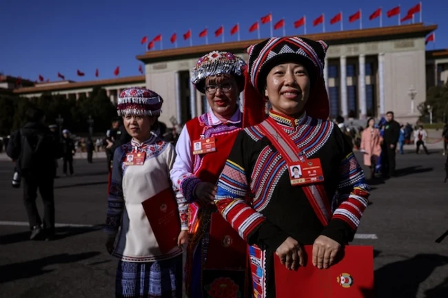 Delegates in ethnic minority costumes leave the Great Hall of the People following the closing session of the Chinese People's Political Consultative Conference (CPPCC), in Beijing, China, March 11, 2026. REUTERS/Tingshu Wang