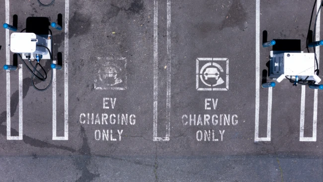 An electric vehicle charging location is shown from the view of a drone in Carlsbad, California, U.S., May 14, 2025. REUTERS/Mike Blake/File Photo