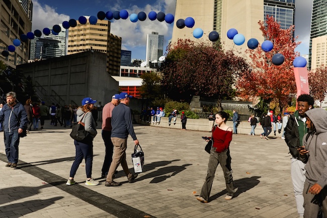Toronto Blue Jays fans gather outside Rogers Centre ahead of Game 1 of the World Series against the visiting Los Angeles Dodgers, in Toronto, Ontario, Canada, October 24, 2025. REUTERS/Wa Lone