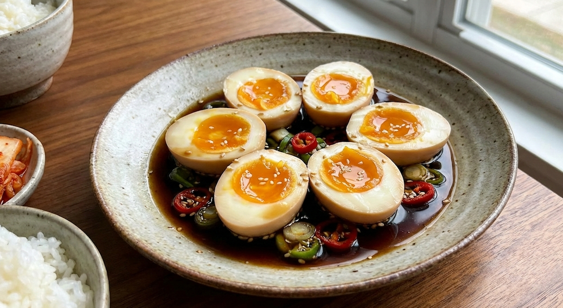 Korean Mayak Eggs over rice. (Image credit: @sanjcooks on Instagram)