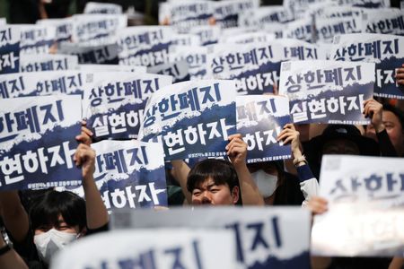 Samsung Electronics’ labour union members chant slogans during a protest against company’s compensation levels ahead of a planned lengthy strike in front of Samsung Electronics semiconductor plant in Pyeongtaek, South Korea, April 23, 2026. REUTERS/Kim Hong-Ji