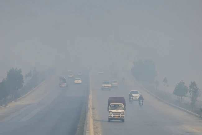 Vehicles move amid smog and air pollution during morning hours in Peshawar, Pakistan, November 28, 2025. REUTERS/Fayaz Aziz